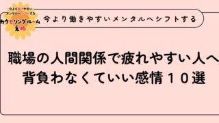 今より働きやすいメンタルへシフトする 職場の人間関係で疲れやすい人へ|背負わなくていい感情10選 職場で疲れやすい人は、気づかないうちに「自分の仕事」ではなく 「人の感情」まで抱えてしまう ことがあります。・相手の機嫌・相手の不安・相手の怒り・職場の空気本来それは、あなたが背負うものではありません。今回は、職場で背負わなくていい感情を整理してみました。 2026.03.07 今より働きやすいメンタルへシフトする